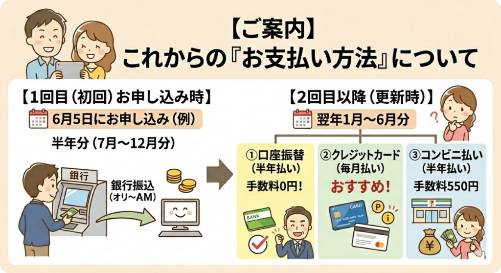 その次の更新となる「翌年1月~6月分」からは、後述する3つの支払い方法からお選びいただく形となります。