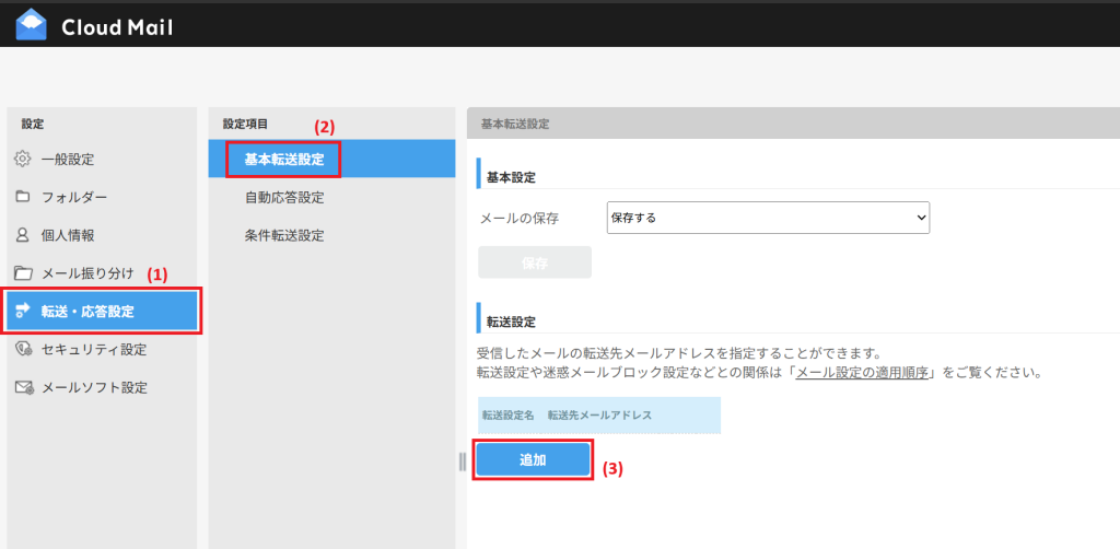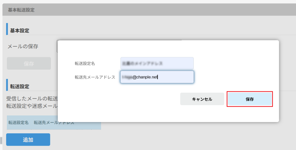 「転送設定名」、「転送先メールアドレス」を入力し「保存」をクリックします。